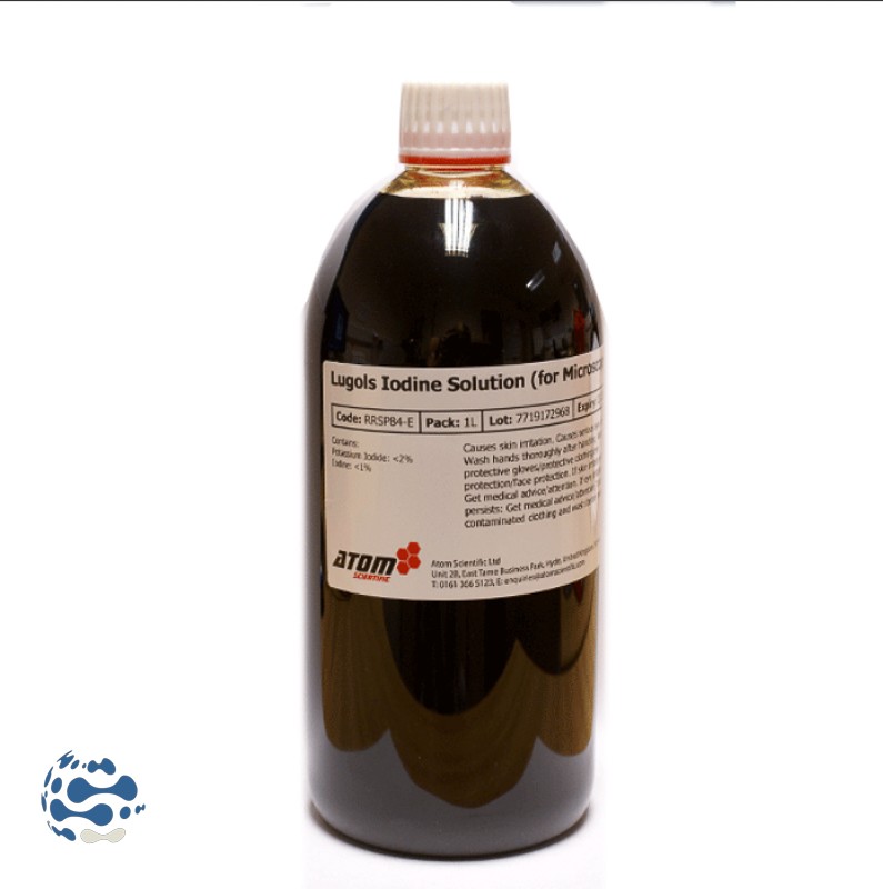 Lugol en solution utilisé pour la coloration de Gram, comme agent oxydant ou pour éliminer les artefacts de fixation mercurielle.